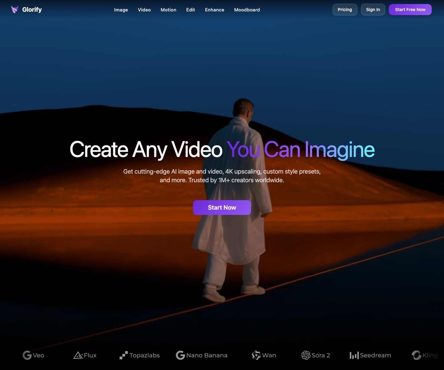 As of March 11, 2026, Glorify positions itself as an all-in-one AI creative platform for creators and brands. Its public site highlights AI image generation, AI video generation, 4K upscaling, custom style presets, and access to multiple popular models. That broad positioning makes Glorify interesting for people who want one place for image, video, enhancement, and style experimentation.
